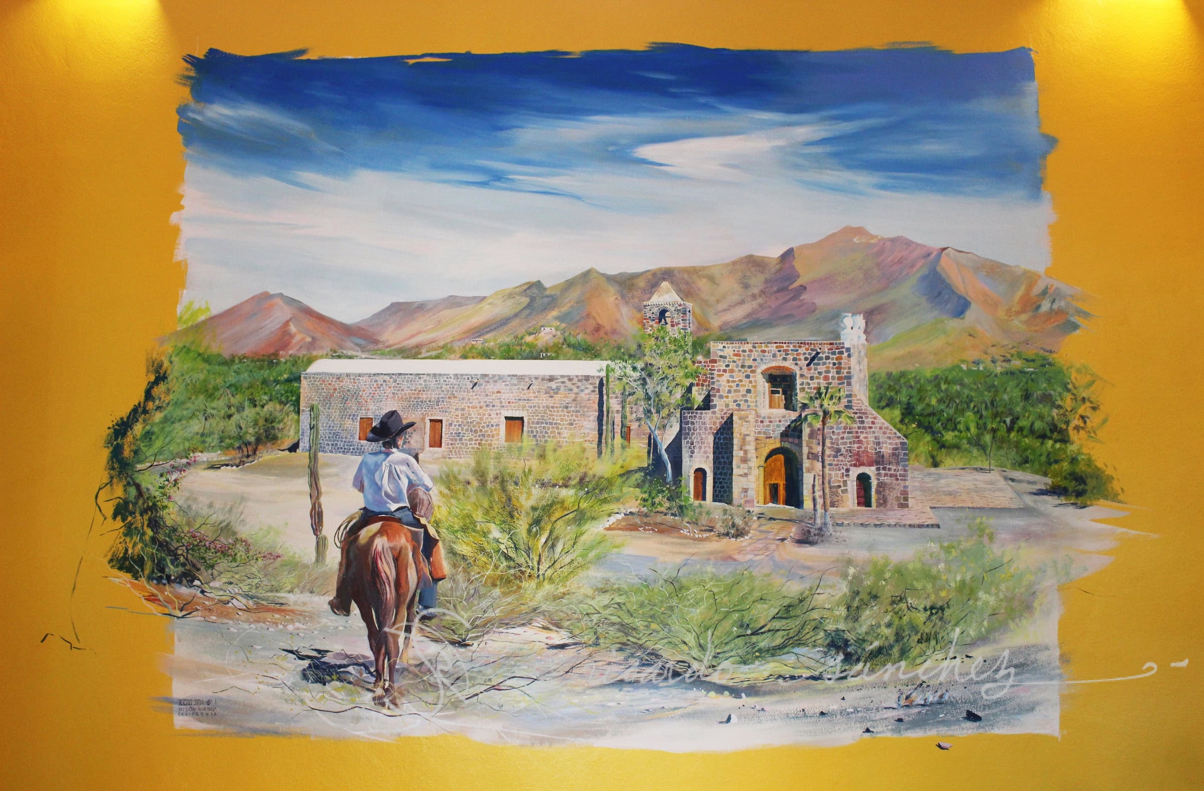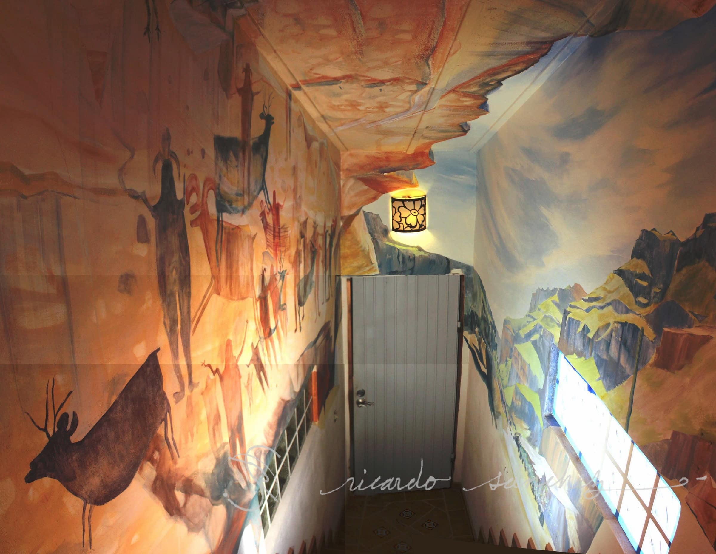 The request for a “cave painting” in an enclosed stairwell sounded easy, until you recognize that Baja cave paintings are not in caves, but on rock walls underneath rocky ledges. The hallway needed to be transformed into the scene of where the paintings would be found based on an actual location in Baja California Sur.