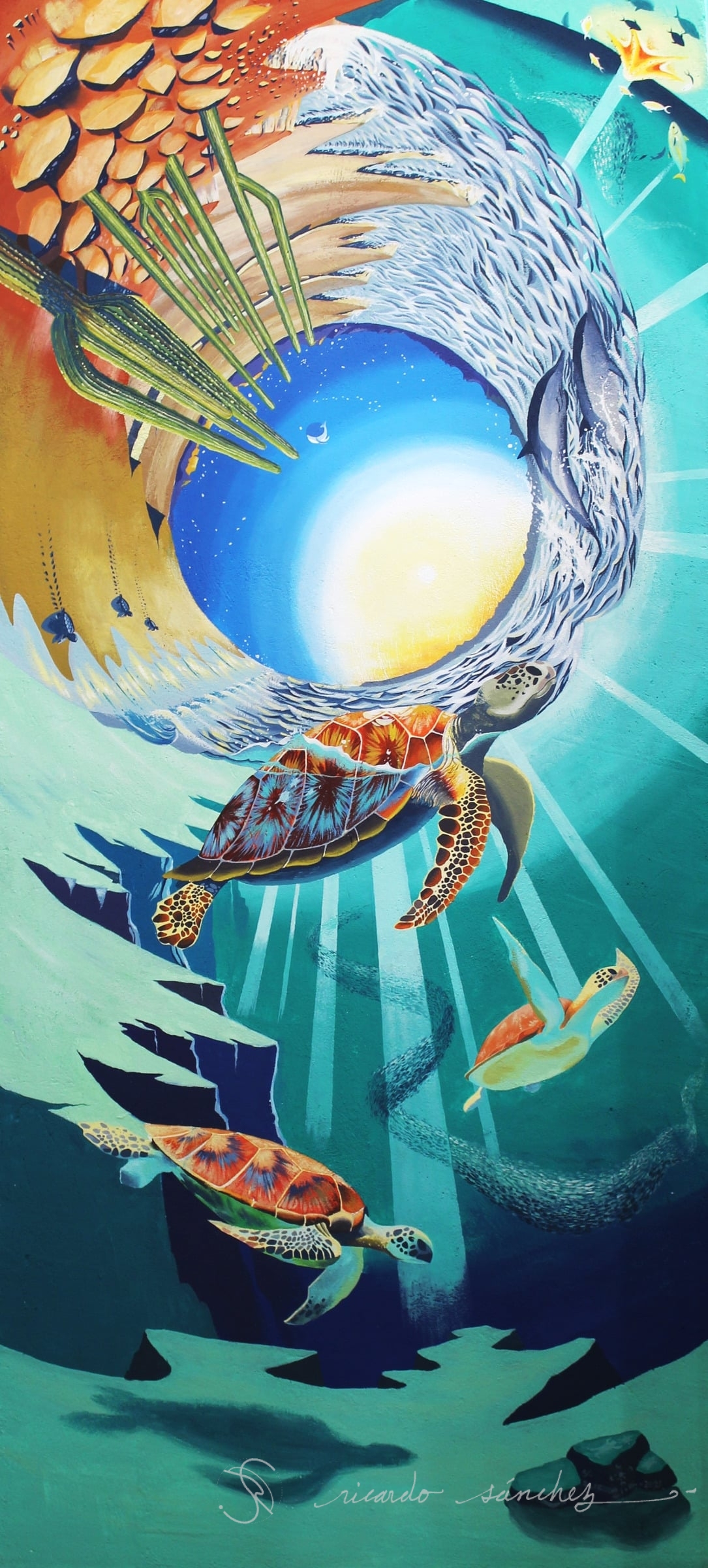 The Sun as a starfish and the Moon as a whale shark witness the endless cycle of life, death and rebirth.