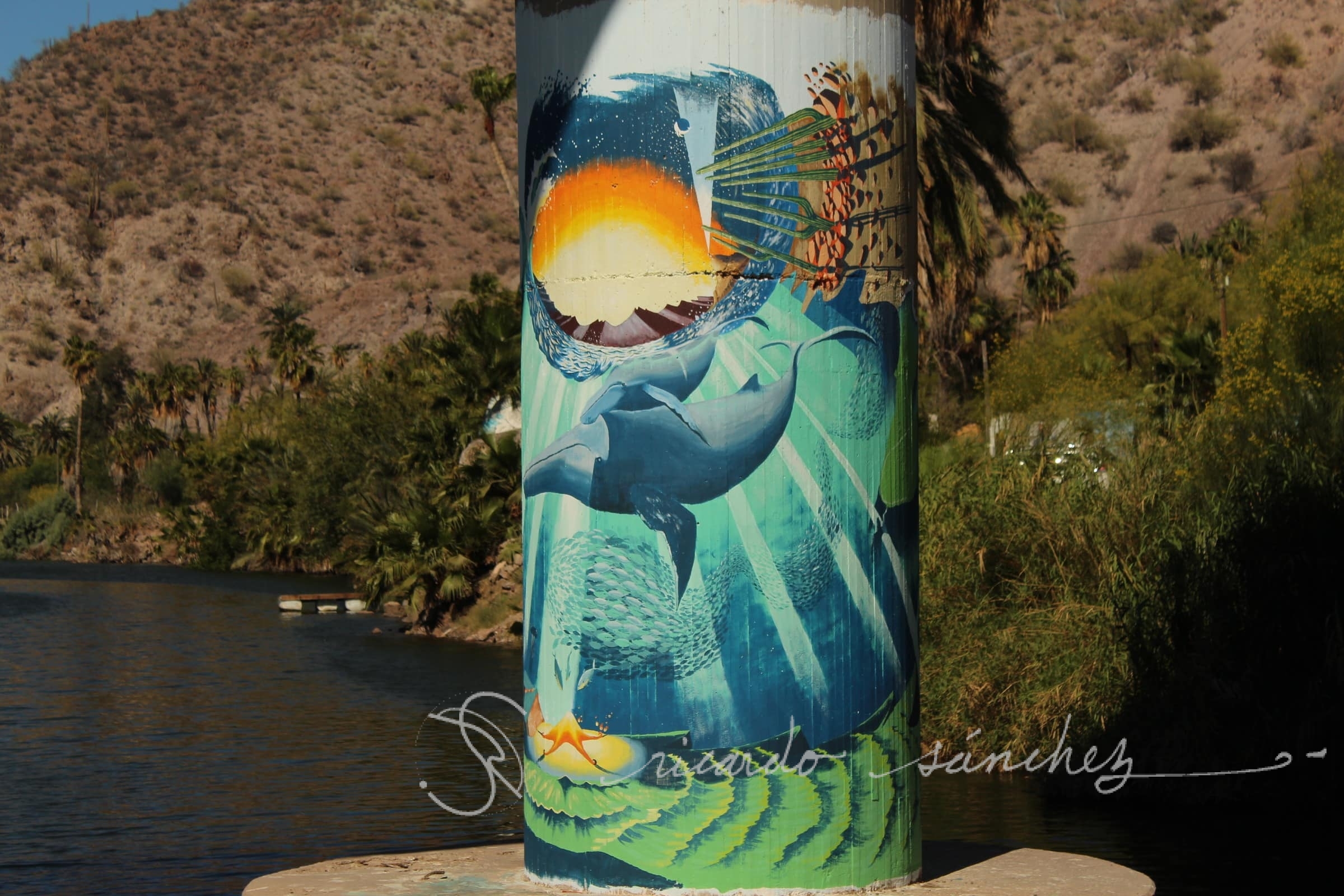 A morning scene of the Mulegé river from the water tower of the old abandoned hotel in the neighborhood of Loma Azul. The vultures bathing in the morning sun. This is a place that quickly returns to the earth where it came from.